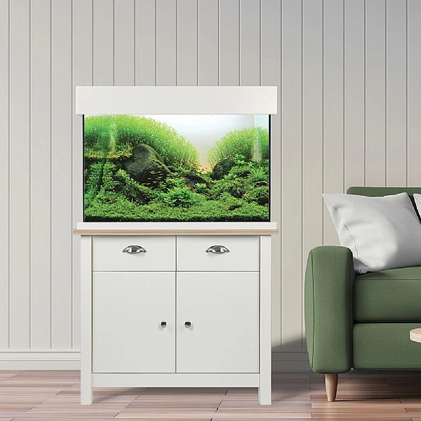 - With its perfect Soft White finish, and sturdy shaker style doors with beautiful solid metal handles, the Aqua One Oak Style Aquarium is the perfect way to keep fish without compromising your home decor