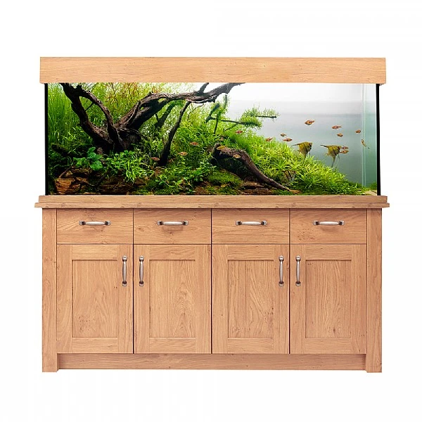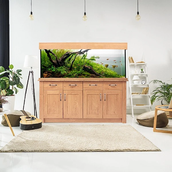 - With its robust Oak Effect Finish, and sturdy shaker style doors with beautiful solid metal handles, the Aqua One Oak Style Aquarium is the perfect way to keep fish without compromising your home decor