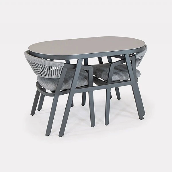 - Set comprises: 2 x dining chairs, 2 x cushion pads, 1 x compact oval table