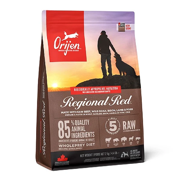 - Orijen™ Regional Red diet is packed with 85%* quality animal ingredients like raw** beef, wild boar, bison, lamb and pork.